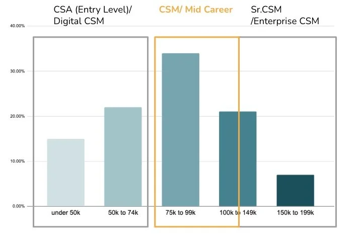 Career transitioners are rarely hired as Sr. CSMs since they have a handful of accounts, each representing millions of dollars in business. They are too high risk to put an untested CSM into for most companies. These roles are a clear career path after 1+ years as a CSM and typically pay in the $120k-$175k range. Or CSMs can move into team leadership roles which are a similar range with a pathway to Director of CS or VP of CS at a startup which often pay in the $150k to $250k range.