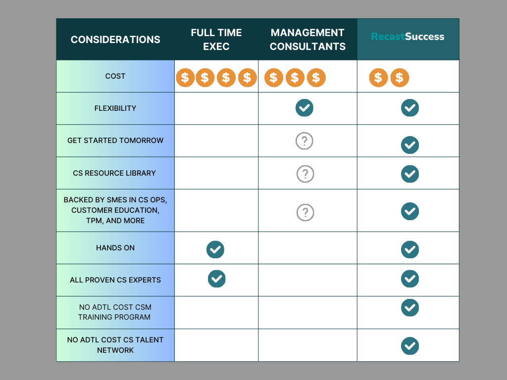 Our Fractional Leaders have started CS organizations from scratch to scale. Each has a minimum of 10 years working in Customer Success with 5-25 in leadership roles.